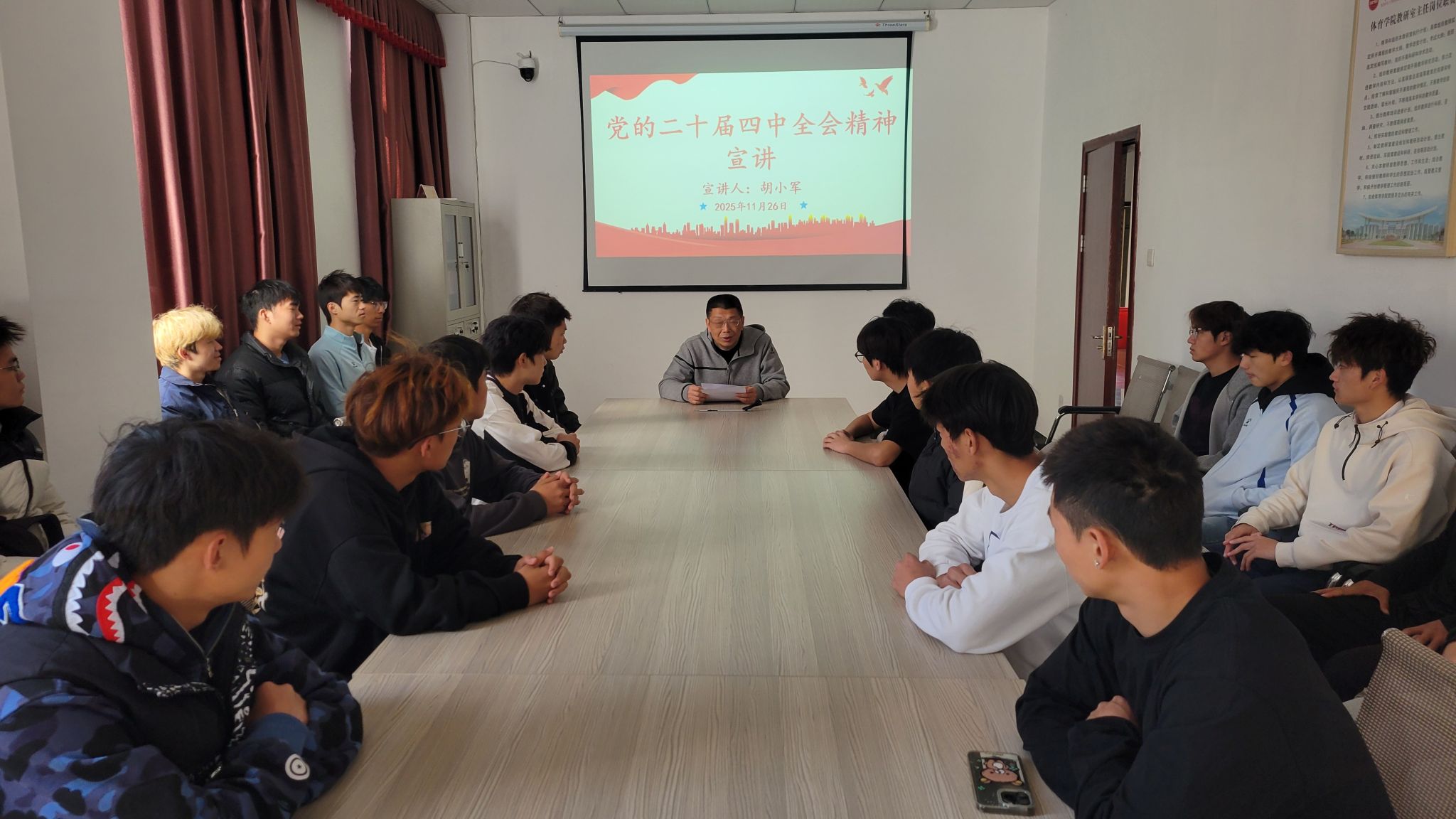 11月20日,党委副书记刘泉以《深学全会精神 勇担青春使命——做新时代体育青年追梦人》为题,向25级体教1班员工开展专题宣讲。他紧密结合习近平总书记关于青年工作的重要思想,解读了全会对青年一代的殷切期望,强调青年体育学子要将个人成长与体育强国建设紧密结合,鼓励员工通过运动训练、学科竞赛等锤炼专业技能,夯实专业基础,展现体育青年的昂扬风貌。