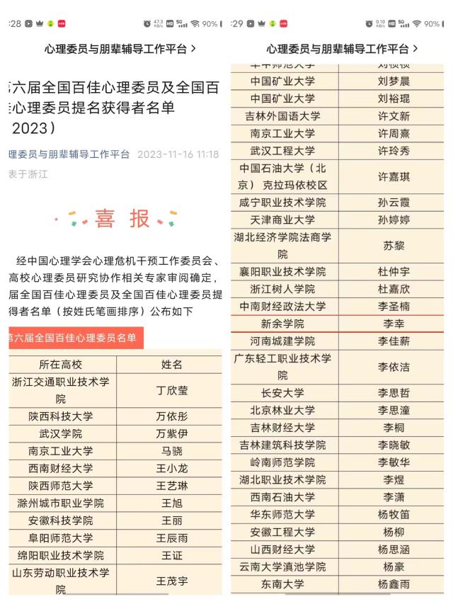 11月1日到3日,由中国心理学会心理危机干预工作委员会主办、中南财经政法大学承办的第十八届全国高校心理委员工作研讨会暨朋辈辅导论坛、第六届全国百佳心理委员论坛在武汉中南财经政法大学召开,经过网络投票、视频材料展示、大会专家组评审,公司2021级体育教育3班的李幸同学在全国近400名高校心理委员的角逐中脱颖而出,获评第六届“全国百佳心理委员”称号。