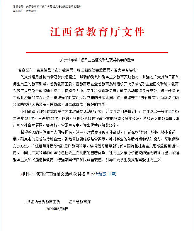 近日,江西省教育厅公布全省教育系统战疫主题征文活动获奖名单,betway88西汉姆联马江龙同学的作品《生命花开 花开绽放》荣获老员工组二等奖。