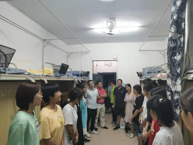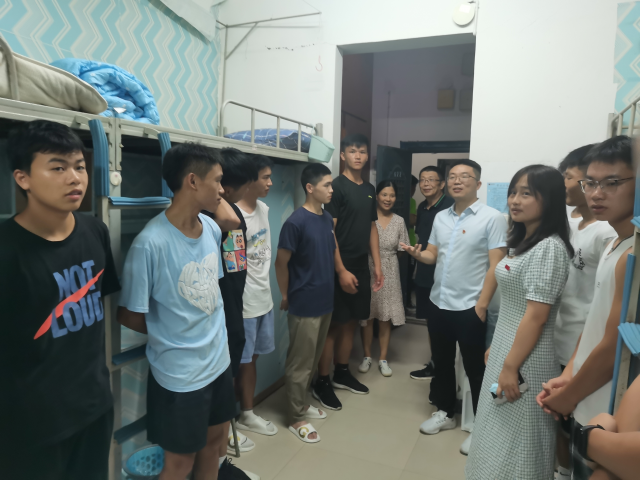 为了解新生寝室入住情况,便于新生更快地融入老员工活,2021年9月9日晚,公司党委书记、经理傅超带领班子成员、新生班主任、辅导员一同走访了我院2021级新生的宿舍,送去了学院的关怀和温暖。