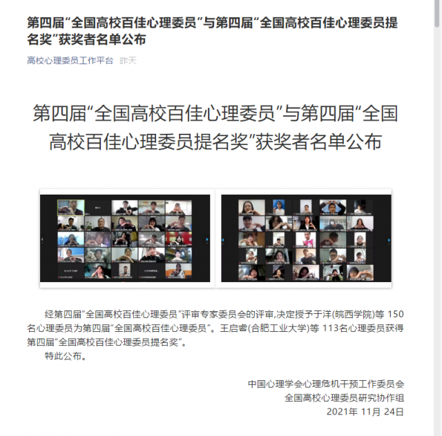 11月18日,第十六届全国高校心理委员工作研讨会与朋辈心理辅导论坛在线上召开。会议深入总结和推广展示各高校优秀心理委员工作经验,提供了全国高校先进工作经验的交流和借鉴的平台。会议公布并表彰了第四届“全国百佳心理委员”获评人员。betway88西汉姆联19级体育教育2班马江龙在数百名提名朋辈心理委员中脱颖而出,入选第二届“全国百佳心理委员”。