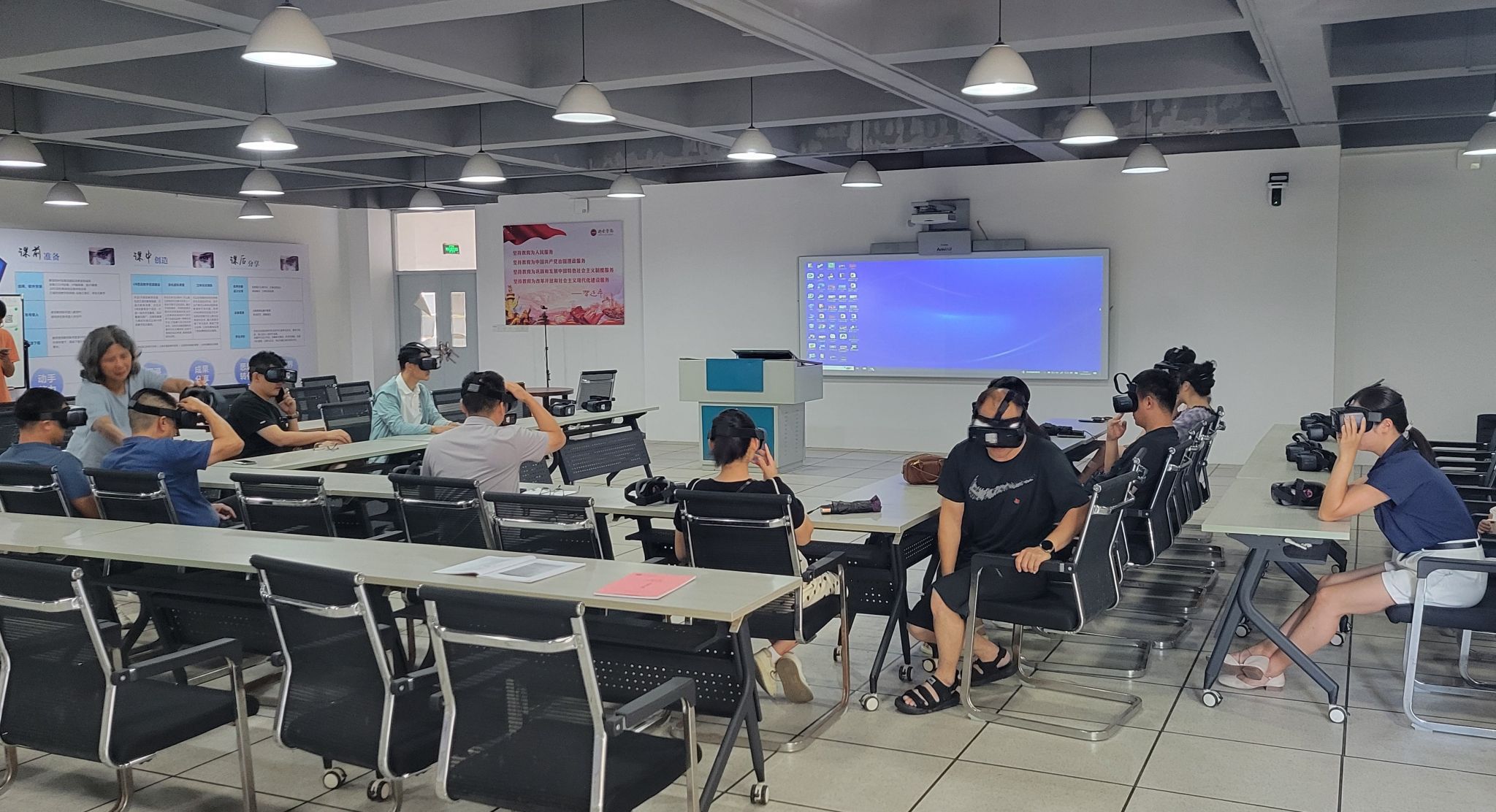 为庆祝中国共产党成立104周年,进一步深入学习贯彻习近平新时代中国特色社会主义思想,切实强化党员干部党性修养,6月30日,betway88西汉姆联教工党支部在学校VR思政教学研究中心开展红色景点场馆体验学习交流活动。