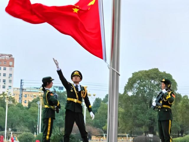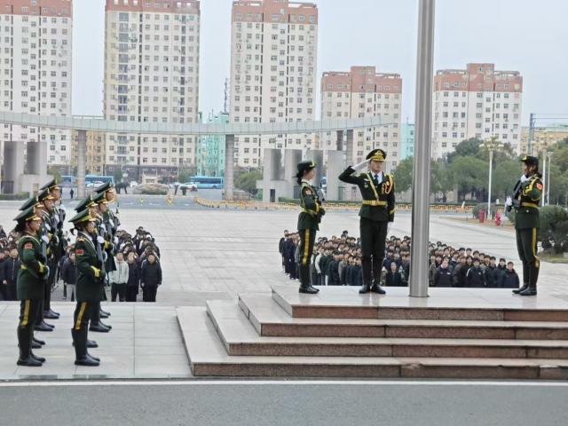 迎着晨曦,国旗护卫队迈着铿锵有力的步伐,护卫着鲜艳的五星红旗走向升旗台。伴随着雄壮的《义勇军进行曲》,五星红旗冉冉升起,全体师生面向国旗行注目礼,现场气氛庄严肃穆。升旗仪式结束后,24级员工代表进行爱国朗诵《红色记忆永恒之光》,表达赤诚的爱国之心和对革命先辈的崇高敬意。