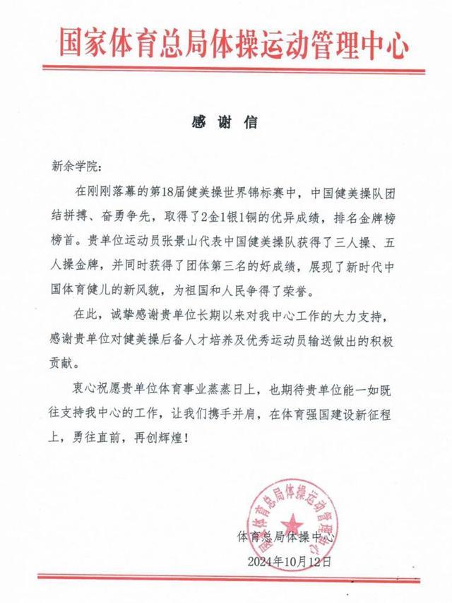 感谢信中提到:“贵单位运动员张景山代表中国健美操队获得了三人操、五人操金牌,并同时获得了团体第三名的好成绩,展现了新时代中国体育健儿的新风貌,为祖国和人民争得了荣誉。在此,诚挚感谢贵单位长期以来对我中心工作的大力支持,感谢贵单位对健美操后备人才培养及优秀运动员输送做出的积极贡献。”