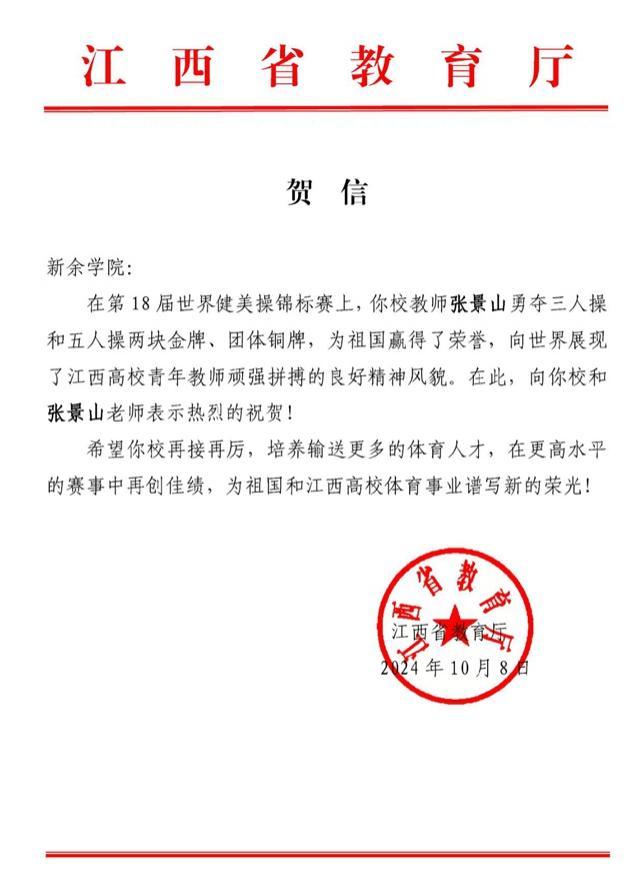 10月8日,江西省教育厅向公司发来贺信,对公司教师张景山在第18届世界健美操锦标赛上勇夺三人操和五人操两块金牌、团体铜牌表示热烈祝贺!