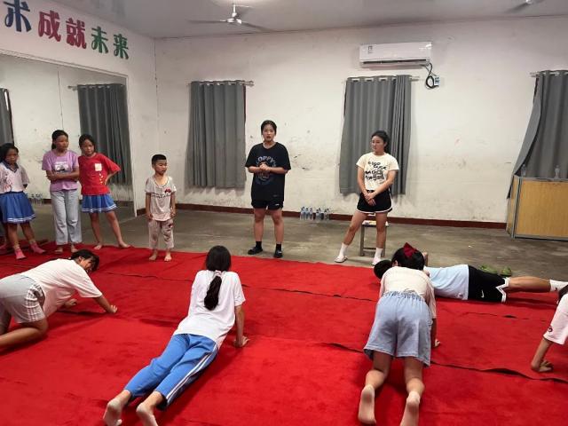 稍微休整之后,孩子们便开始了上午的啦啦操训练。经过前两天的训练,孩子们的啦啦操已经初步成型了,已经可以很好地掌握舞蹈动作的节奏性。于是,孩子们今天更自信了,学得也更加卖力啦。